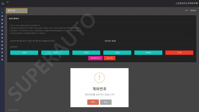 가상머니는 최초 회원 가입시에 1,000 만원이 자동으로 충전됩니다.
